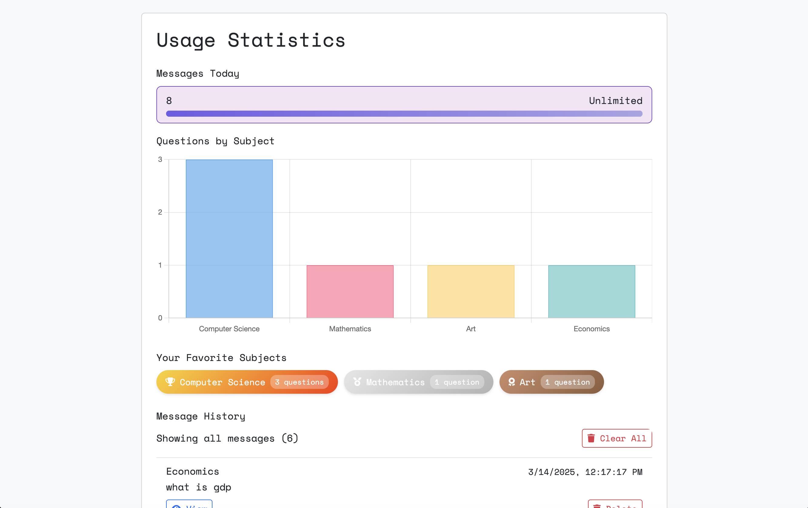 Ask about any subject, including custom topics, and receive real-time AI-powered tutoring.